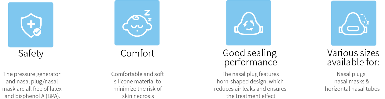 Equipped with NV8 NV Flow /Neo.Flow pressure generator, which is safe, comfortable and features good sealing performance. Fully compatible with infant flow/infant flow LP/medijet and other brands to meet different clinical needs. A wide range of nasal plugs and nasal masks to meet the needs of premature babies and infants.